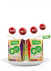 Fami Go (sản phẩm của Công ty Sữa đậu nành Việt Nam – Vinasoy) được thiết kế để cung cấp năng lượng dựa trên nền dinh dưỡng thực vật – từ đậu nành tự nhiên không biến đổi gen và được lựa chọn kỹ lưỡng để tối ưu những giá trị quý báu sẵn có trong đậu nành kết hợp với nếp cẩm – một loại gạo có dinh dưỡng rất cao và đậu đỏ/mè đen – những loại hạt không chỉ có nhiều dưỡng chất mà còn góp phần tạo nên những mùi vị thơm ngon.