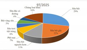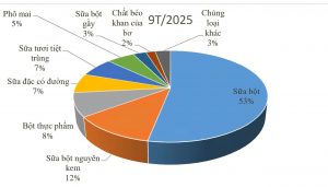 Trong 9 tháng năm 2025, kim ngạch xuất khẩu hầu hết các mặt hàng sữa chính đều tăng so với cùng kỳ năm 2024. Trong đó, kim ngạch xuất khẩu mặt hàng sữa bột đạt trị giá cao nhất là 156,2 triệu USD, tăng 35,3% so với cùng kỳ năm 2024. Thị trường xuất khẩu lớn nhất là Irắc đạt 110,6 triệu USD, chiếm 71% tỷ trọng. Mặt hàng đứng vị trí thứ hai là sữa bột nguyên kem, đạt kim ngạch 34,8 triệu USD, giảm 9,3%. Kim ngạch xuất khẩu một số mặt hàng khác tăng trưởng cao như bơ, nguyên liệu thực phẩm, chất béo khan của bơ, phô mai.