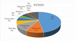 Về thị trường, trong 9 tháng năm 2025, kim ngạch xuất khẩu sang thị trường lớn nhất là Irắc đạt 138,4 triệu USD, tăng 20,5% so với cùng kỳ năm 2024 và chiếm 47% thị phần xuất khẩu. Afganistan là thị trường đứng vị trí thứ hai đạt gần 32 triệu USD, tăng 22,4%.