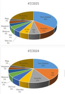 Trong 4 tháng đầu năm 2025, trong các quốc gia có lượng sữa nhập khẩu lớn từ Việt Nam, New Zealand tiếp tục dẫn đầu với tổng kim ngạch đạt 160,8 triệu USD, tăng vọt tới 84,2%.