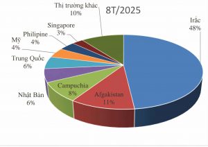 Về thị trường xuất khẩu, trong 8 tháng năm 2025, kim ngạch xuất khẩu sang thị trường lớn nhất là Irăc đạt 124,1 triệu USD, tăng 16,5% so với cùng kỳ năm 2024 và chiếm 48% thị phần xuất khẩu. Afganistan là thị trường đứng vị trí thứ hai đạt 28,6 triệu USD, tăng 21,2%.