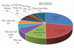 Trong 8 tháng năm 2025, kim ngạch xuất khẩu một số mặt hàng sữa chính tăng so với cùng kỳ năm 2024. Trong đó, kim ngạch xuất khẩu mặt hàng sữa bột đạt trị giá cao nhất là 140,8 triệu USD, tăng 32,8% so với cùng kỳ năm 2024. Thị trường xuất khẩu lớn nhất là Irac đạt 99,9 triệu USD, chiếm 71% tỷ trọng.