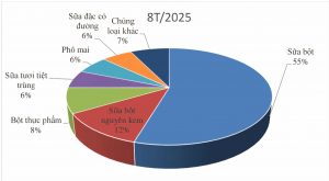 Trong tháng 8/2025, kim ngạch nhập khẩu mặt hàng chính là sữa bột tiếp tục giảm so với tháng 7 trước đó với mức giảm 23,1%. Tuy nhiên, tính chung 8 tháng năm 2025, kim ngạch nhập khẩu vẫn tăng mạnh 32,6% so với cùng kỳ năm 2024 đạt 283,8 triệu USD, chiếm 29% thị phần nhập khẩu. Kim ngạch nhập khẩu lớn nhất là từ thị trường Ailen.
