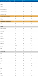 Tinh bột bắp thủy phân, DẦU THỰC VẬT (dầu hướng dương giàu oleic, dầu đậu nành, dầu hạt cải), sucrose, natri caseinat, đạm đậu nành tinh chế, oligofructose, đạm whey cô đặc, KHOÁNG CHẤT (kali citrat, tricanxi phosphat, magiê sulfat, magiê clorid, kali clorid, natri citrat, dikali phosphat, natri clorid, canxi carbonat, dimagiê phosphat, kali hydroxid, sắt sulfat, kẽm sulfat, mangan sulfat, đồng sulfat, crôm clorid, kali iodid, natri molybdat, natri selenat), canxi β-hydroxy-β-methylbutyrat monohydrat (CaHMB), hương liệu vani tổng hợp, Beta Glucan từ nấm men (YBG), VITAMIN (acid ascorbic, ascorbyl palmitat, vitamin E, hỗn hợp tocopherol, canxi pantothenat, niacinamid, pyridoxin hydroclorid, riboflavin, thiamin hydroclorid, vitamin A palmitat, acid folic, beta caroten, phylloquinon, biotin, vitamin D3, cyanocobalamin), cholin clorid, taurin, L-carnitin.