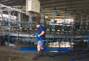 Ông Beacon cha đang vệ sinh hệ thống vòng vắt sữa bò tự động để chuẩn bị cho đợt vắt sữa lần hai trong ngày. Ảnh: P.A.