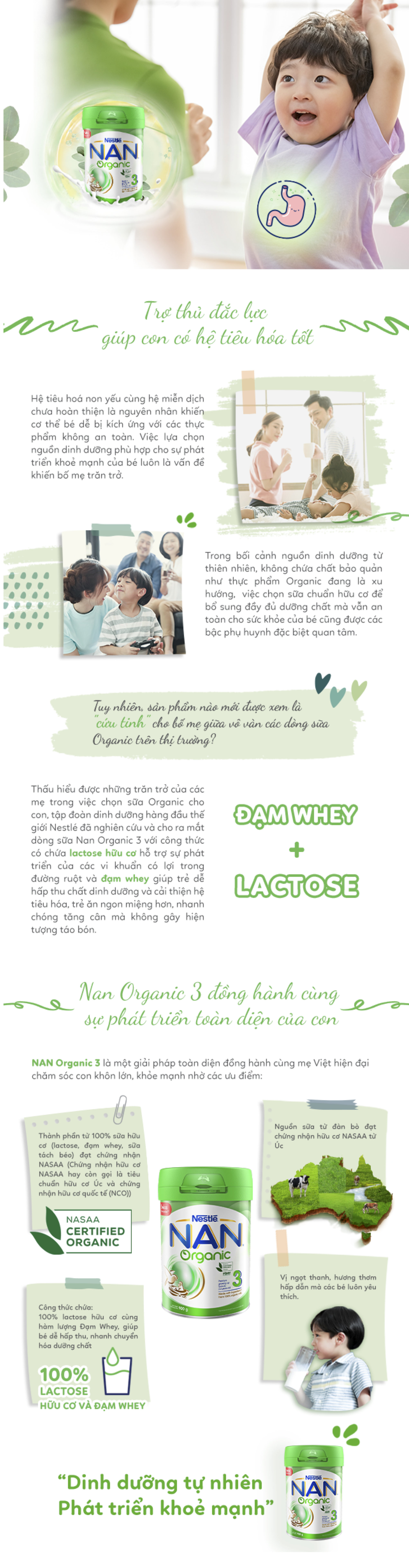 NAN ORGANIC 3 với các thành phần từ 100% sữa hữu cơ (bao gồm sữa tách béo, đạm whey, lactose hữu cơ), đạt chứng nhận hữu cơ từ NASAA (Hiệp hội Quốc gia về nông nghiệp bền vững Australia). Sản phẩm cung cấp lượng đạm whey cùng 100% lactose hữu cơ, góp phần hỗ trợ trẻ giảm táo bón và hỗ trợ hệ tiêu hóa; DHA và ARA góp phần phát triển trí não và thị lực; kẽm và vitamin C, D tăng cường miễn dịch. Sản phẩm hiện được phân phối tại cửa hàng Bibo Mart, Kids Plaza, Shoptretho trên các sàn thương mại điện tử: Tiki, Shopee, Lazada. Sản phẩm Nan Organic 3 được sản xuất và phân phối bởi Nestlé – một trong những tập đoàn dinh dưỡng và sức khoẻ hàng đầu thế giới với hơn 150 năm kinh nghiệm trong lĩnh vực dinh dưỡng dành cho trẻ nhỏ. Công ty TNHH Nestle Việt Nam chịu trách nhiệm đưa sản phẩm ra thị trường. (Địa chỉ: Công ty TNHH Nestlé Việt Nam, Số 7 đường 17A, KCN Biên Hòa 2, Phường An Bình, Thành Phố Biên Hòa, Tỉnh Đồng Nai, Việt Nam) Nestlé tin rằng nuôi con bằng sữa mẹ là khởi đầu dinh dưỡng lý tưởng cho trẻ sơ sinh và chúng tôi hoàn toàn ủng hộ khuyến nghị của Tổ chức Y tế thế giới về việc cho trẻ bú mẹ hoàn toàn trong sáu tháng đầu đời, sau đó là cho trẻ ăn thức ăn bổ sung dinh dưỡng đầy đủ cùng với việc tiếp tục cho trẻ bú mẹ đến hai tuổi hoặc lâu hơn. NAN ORGANIC 3 không phải là sản phẩm thay thế sữa mẹ. Vì trẻ tăng trưởng với tốc độ khác nhau, hãy hỏi ý kiến nhân viên y tế về thời điểm thích hợp bắt đầu cho con của bạn sử dụng sản phẩm này. |