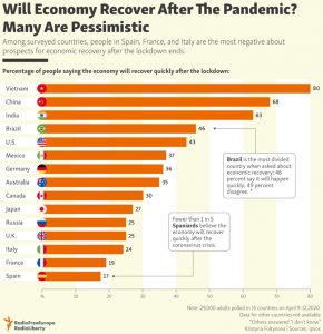 Trái lại, hầu hết người dân Tây Ban Nha (76%), Pháp (72%), Italia (68%), Vương quốc Anh (67%), Nga và Nhật Bản (64%) và Canada (62%) cảm thấy bất an về tương lai của nền kinh tế, trước những tác động lâu dài từ cuộc khủng hoảng sức khỏe toàn cầu.