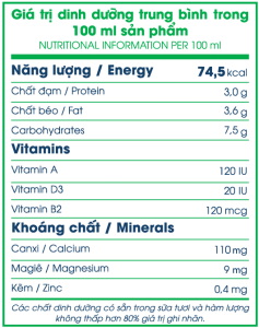Giá trị dinh dưỡng từ 100% sữa bò tươi nguyên chất giúp cung cấp Năng lượng, các Vitamin và Khoáng chất cần thiết cho cơ thể khỏe mạnh.